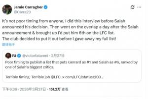 卡拉格回复这名球迷:“这绝非任何人的时机考量失当——我早在萨拉赫宣布决定前就完成了这次采访。萨拉赫官宣的次日,我才在Overlap节目里展开后续话题,提到自己将他排在利物浦队史榜单的第六位。可俱乐部在我公布完整榜单之前,就把这段内容发布了出去!”