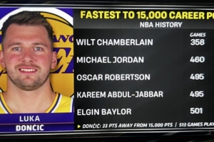 现场给出统计,东契奇距离15000分只差33分,今天是他生涯的第513场比赛。