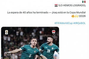 伊拉克时隔40年重返世界杯,伊拉克队官方社媒用阿拉伯语、英语、西班牙语写道:“我们做到了,40年的等待结束,伊拉克晋级2026年世界杯!”