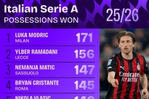 本赛季意甲夺回球权榜:40岁莫德里奇171次第一,马蒂奇第三